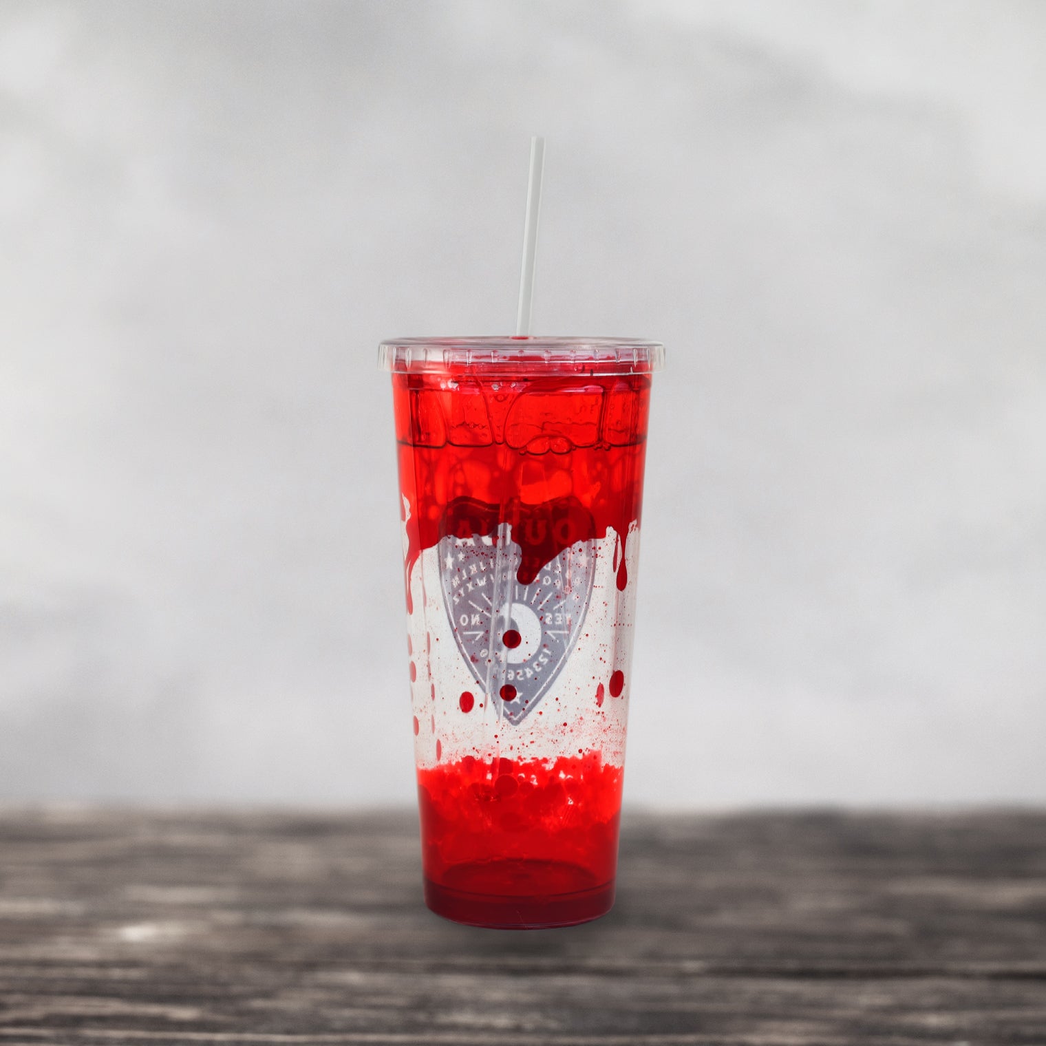 Invoca tu bebida favorita con este espectacular vaso de 24 onzas. Su diseño hipnótico presenta el clásico puntero (planchette) de la tabla Ouija, la llave para comunicarte con el "otro lado".